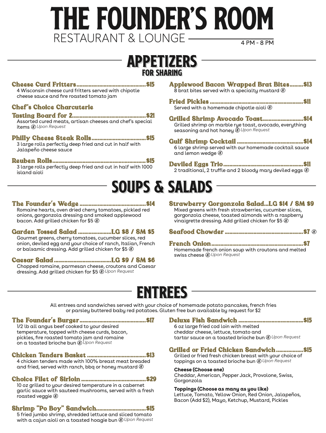 Come join us and experience great food and a great atmosphere in this hidden gem we call the Founder’s Room.