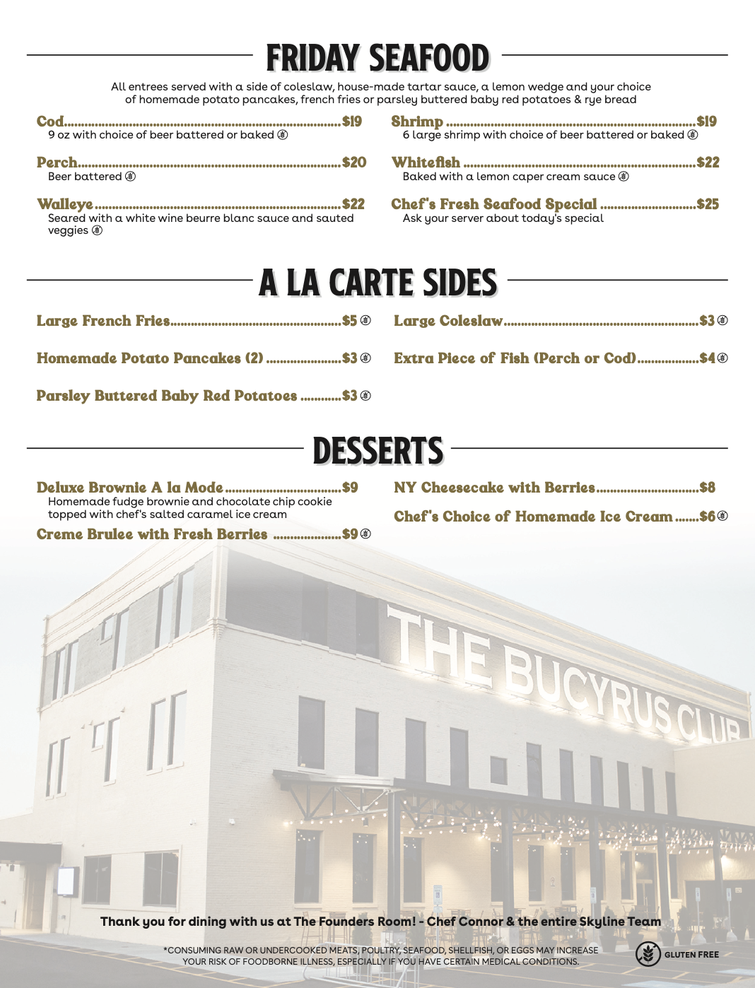 This is not your ordinary fish fry! From tasty appetizers to hearty main dishes and unique sides to house-made ice cream for dessert, the Bucyrus Club fish fry raises the bar on a Wisconsin tradition. And check back to see what Chef Connor and his team have on special that week.